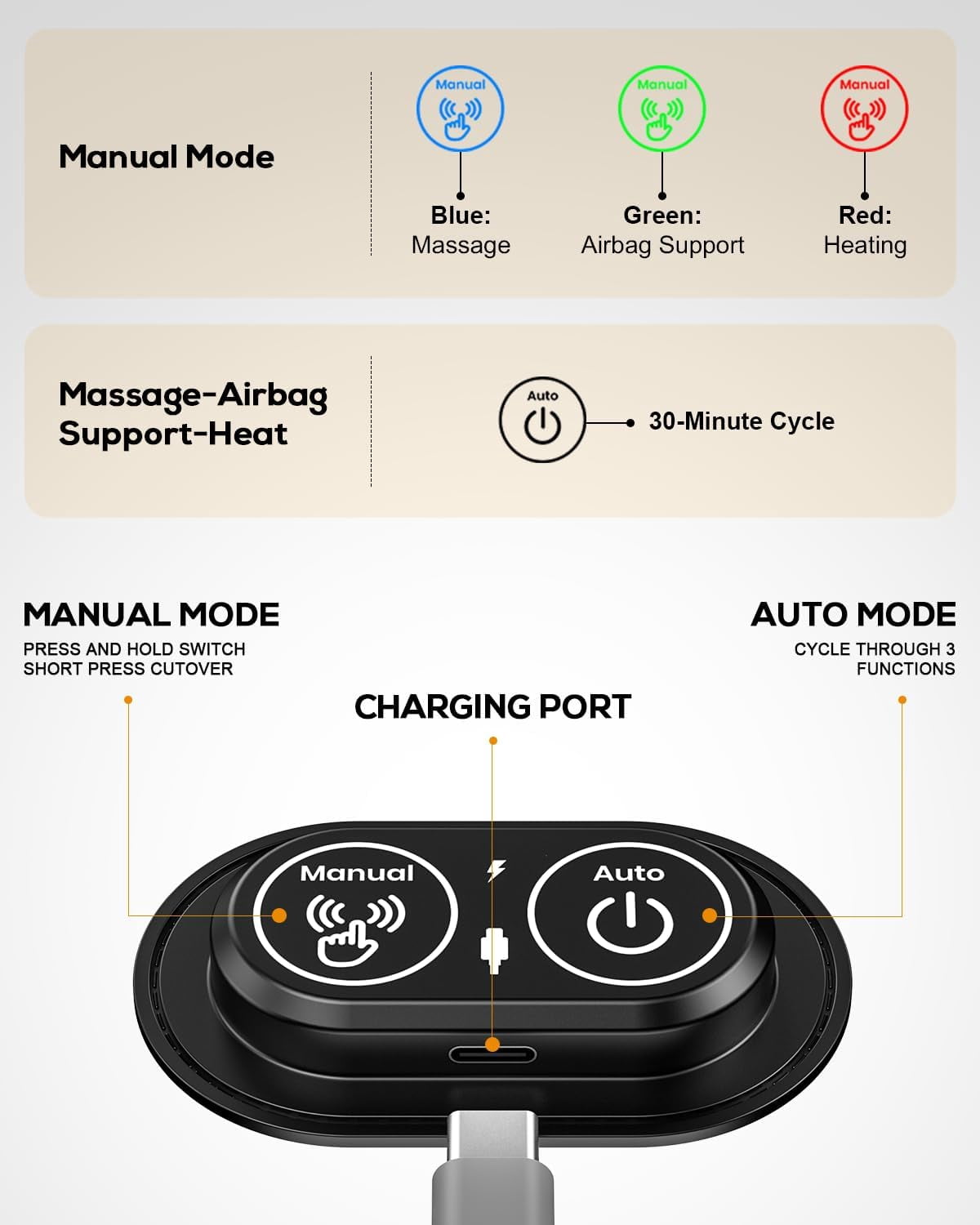 【Triple Therapy Relief】Enjoy vibration massage, soothing warmth, and smart air lift in one device. Switch between automatic cycling or manual mode for customized comfort all day long. 【Adjustable Air Lift Support】Gently lift your lower back with one-touch inflation. The airbag adjusts to your preferred height, reducing strain from prolonged sitting for personalized, pressure-relieving comfort. 【Ergonomic Memory Foam Design】Contoured to support your spine’s natural curve. Premium slow-rebound foam distributes weight evenly, while breathable materials keep you cool and comfortably cradled. 【Breathable All-Day Comfort】Made with soft, air-mesh fabric that wicks moisture and stays cool. Perfect for your office chair, sofa, car seat, or bed—bringing comfort anywhere you sit or relax. 【Simple Plug & Play Use】Easy button controls with clear lights make operation effortless. Just plug into an outlet (adapter 5V/2A or higher recommended) for steady, reliable support anytime.