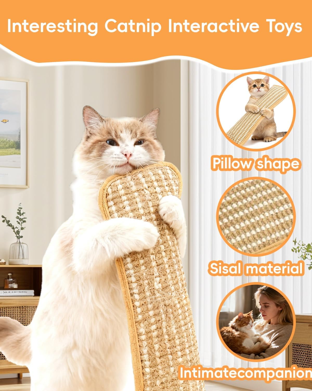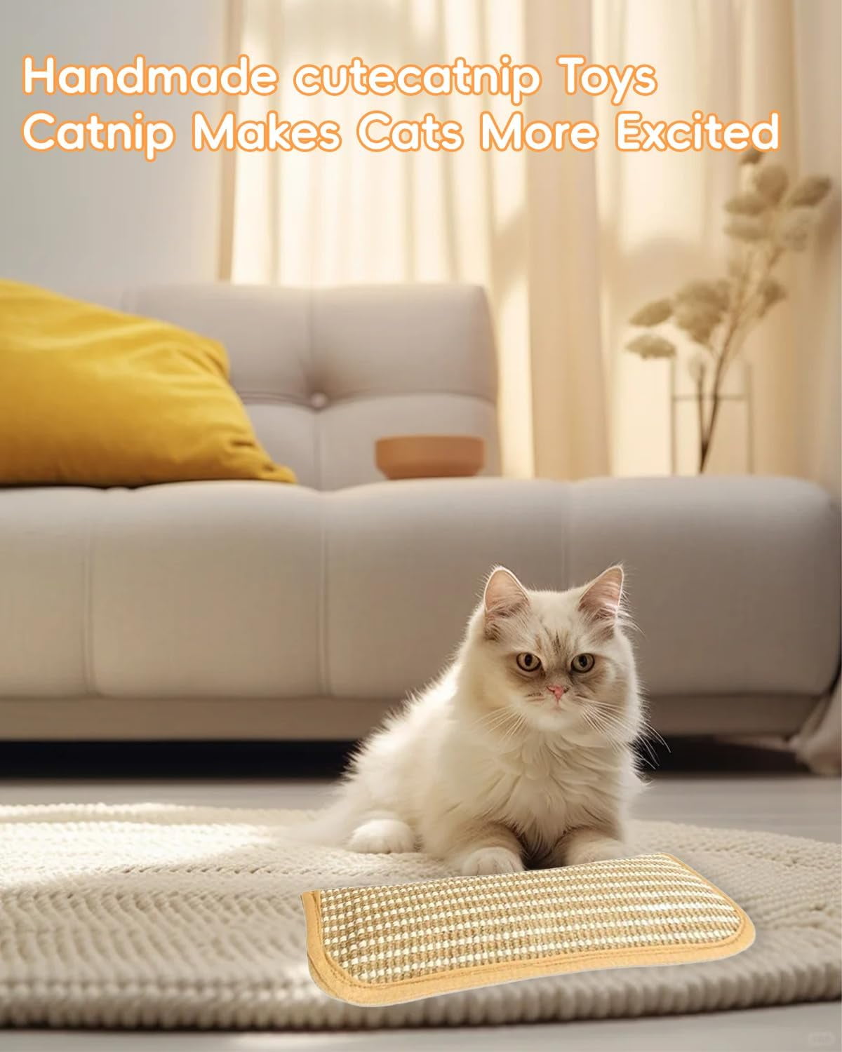 Product DescriptionCatnip Toys – Sisal Scratching Pad, Retro Cat Toys Kicker Pillows Crinkle Refillable Catnip Toys Catnip Pillows for Cats for Teeth Care Kitten Training Play Interactive Bonding Product Name: Sisal Catnip Kicker Toy Dimensions: 34 x 9.5 cm (13.39 x 3.74 inches) Weight: 150g Material: Natural Sisal, Plush, Catnip Suitable For: Kittens, Adult Cats, Seniors Package Include: 1 * Catnip Toys Notes Manual measurement may result in slight deviations; please allow a 1-3cm margin of error. Due to differences in lighting and shooting conditions, the actual color may vary slightly from the images shown.