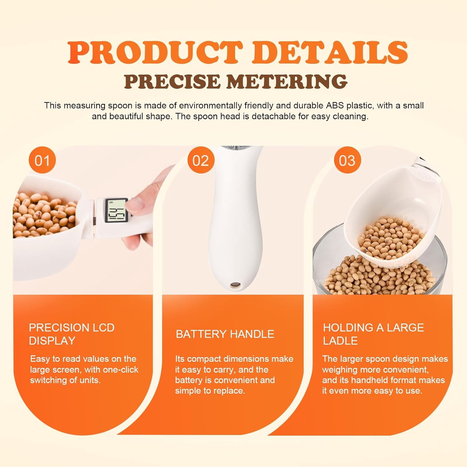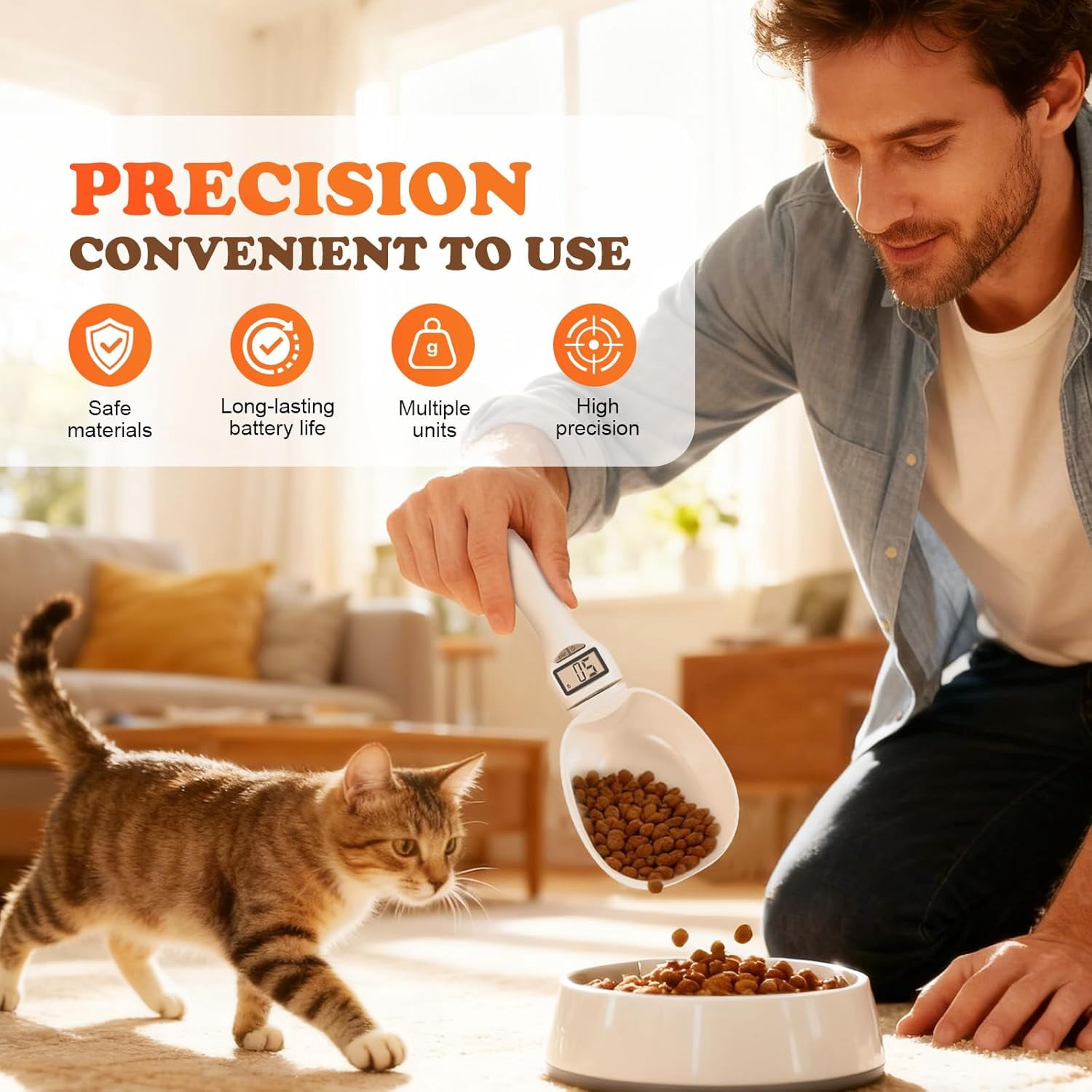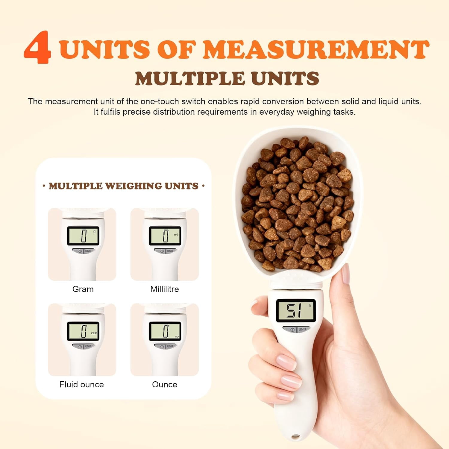【High Precision from 1g to 800g】Achieve accurate, reliable measurements for cooking, baking, or pet food. Advanced sensors ensure consistent results every time you weigh. 【Clear, Easy-to-Read LCD Display】Features a bright LCD screen for instant, easy-to-read results. The user-friendly design makes checking measurements simple at a glance. 【4 Units with One-Touch Switching】Effortlessly toggle between grams, milliliters, cups, and ounces. Perfectly adapts to any recipe or pet feeding guide with a button press. 【Removable Scoop for Easy Cleaning】The spoon head detaches in seconds for quick, thorough cleanup. Made from durable, high-quality plastic for long-lasting use. 【Perfect for Kitchen & Pet Care】Ideal for portioning pet food, baking ingredients, spices, and liquids. Your versatile helper for healthy pets and precise recipes.