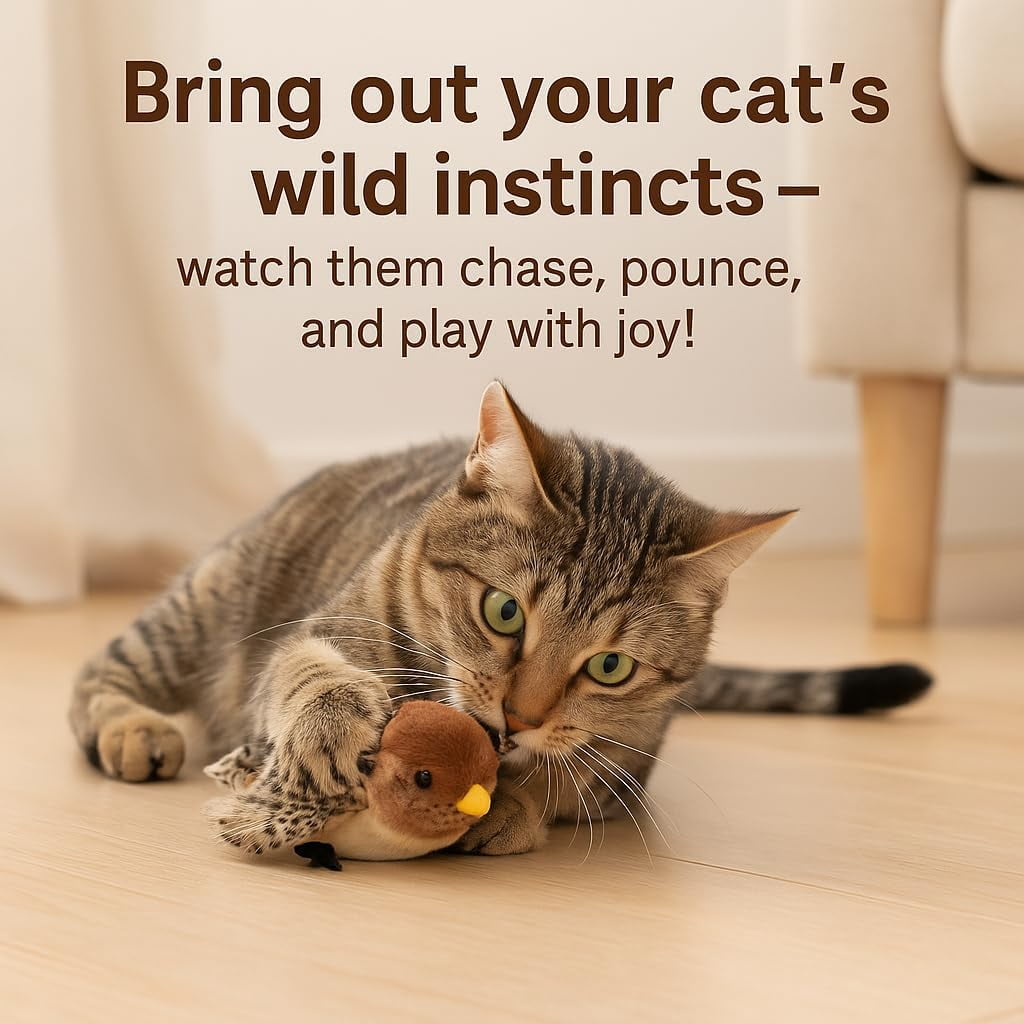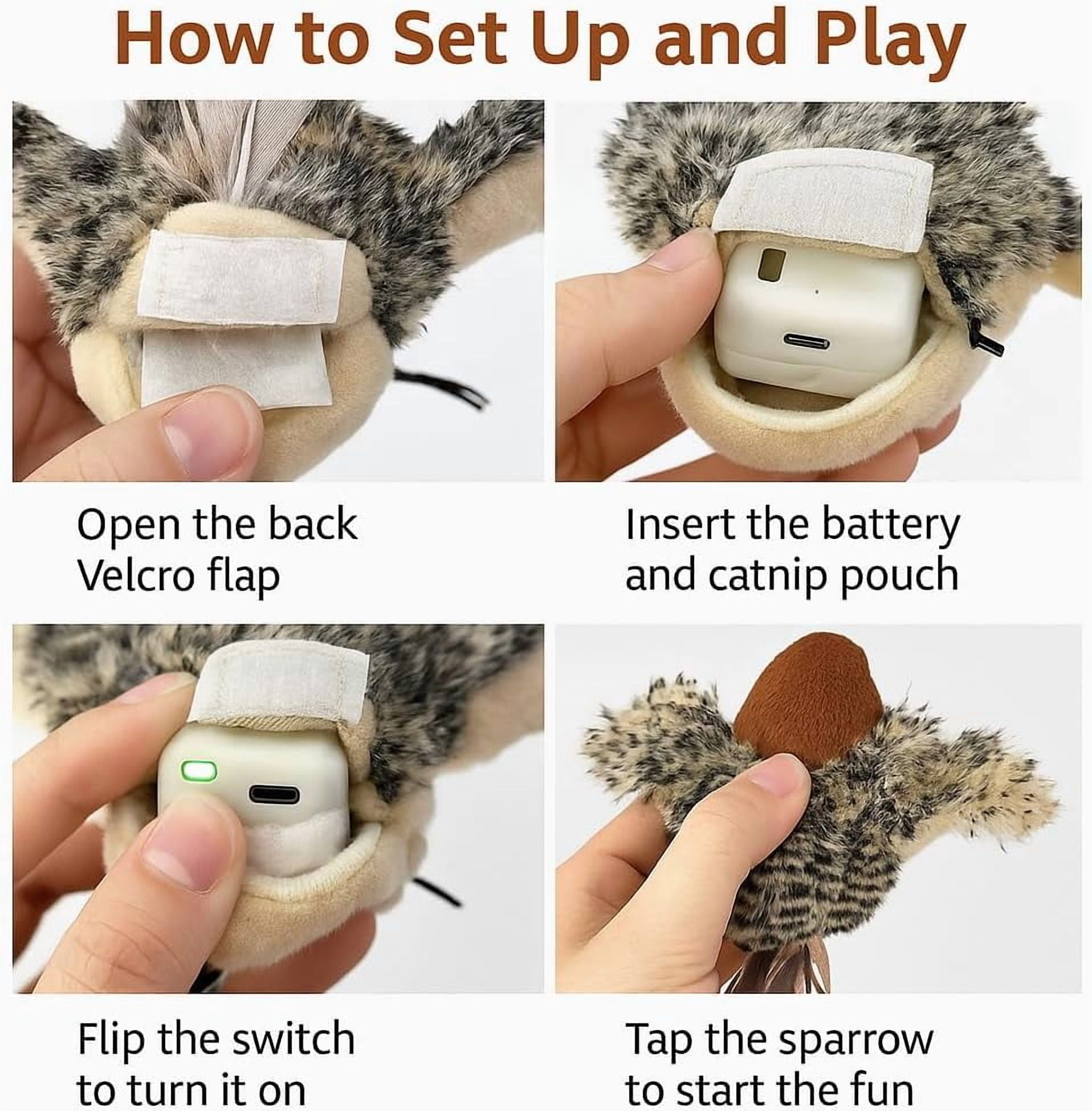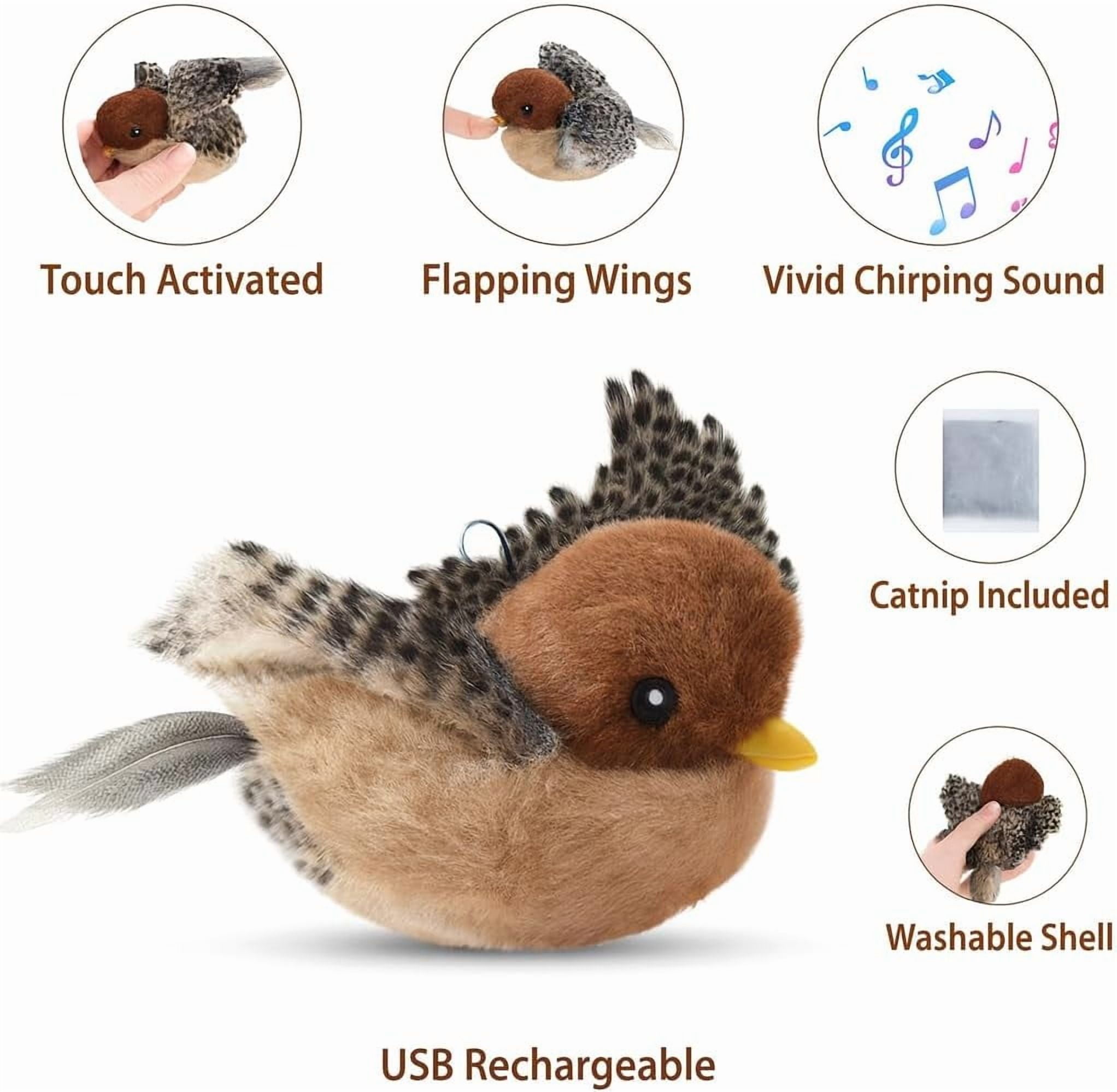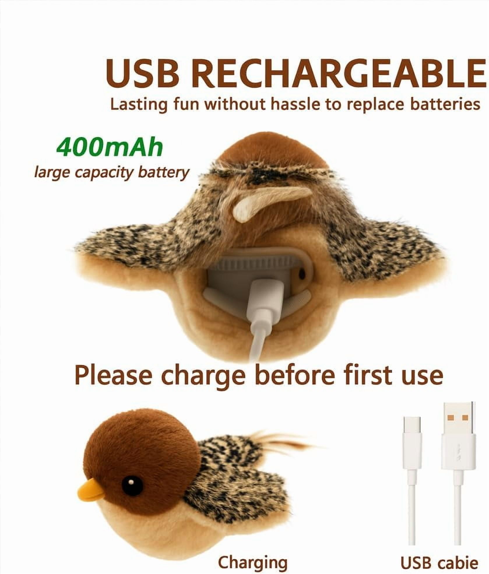 【Interactive Flapping & Chirping】This touch-activated bird toy flaps its wings and chirps like a real bird, triggering your cat’s natural hunting instincts. Automatically enters energy-saving mode when not in use, providing exciting yet efficient play. 【Motion Sensor & Remote Control】Features built-in motion detection with three frequency modes for instant response to your cat’s movements. Includes a convenient remote for easy mode switching, enabling hands-free interactive play that keeps cats engaged for hours. 【USB Rechargeable & Long-Lasting】Eco-friendly USB charging fully powers the toy in 40-60 minutes for 5-6 hours of continuous play. Important: Use standard 5V/1A charger only. Remember to charge before initial use for optimal performance. 【Safe & Durable Materials】Crafted from premium plush fabric with durable filling that’s gentle on cats’ teeth and paws. Features a detachable shell for easy cleaning, plus includes feather tail and catnip pouch for added attraction. 【Perfect Indoor Entertainment】Specifically designed for indoor cats, can be hung on elastic ropes for varied play. Provides essential mental and physical stimulation, making it an ideal gift that brings fun and activity to any cat-loving home.