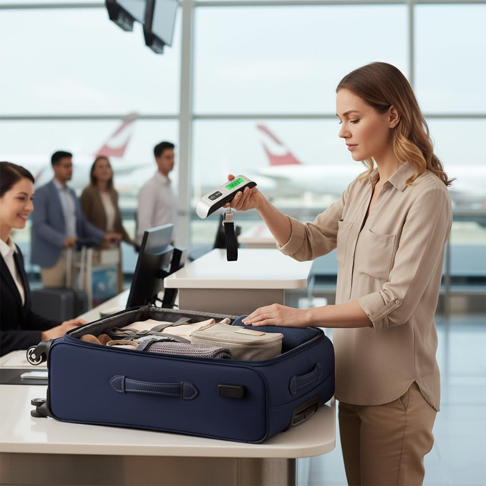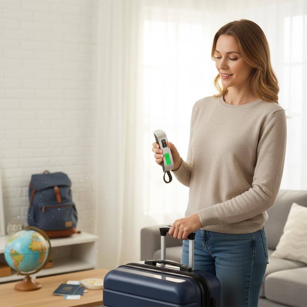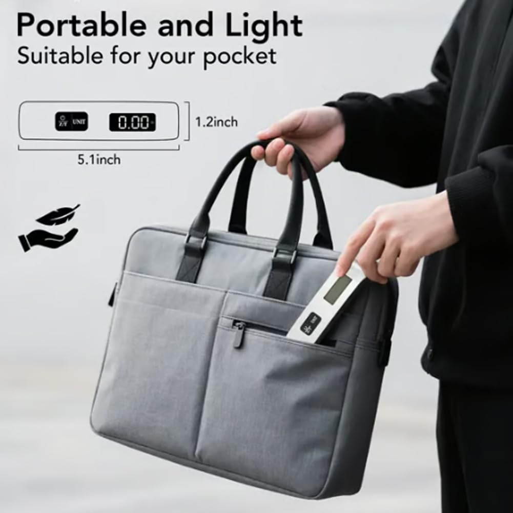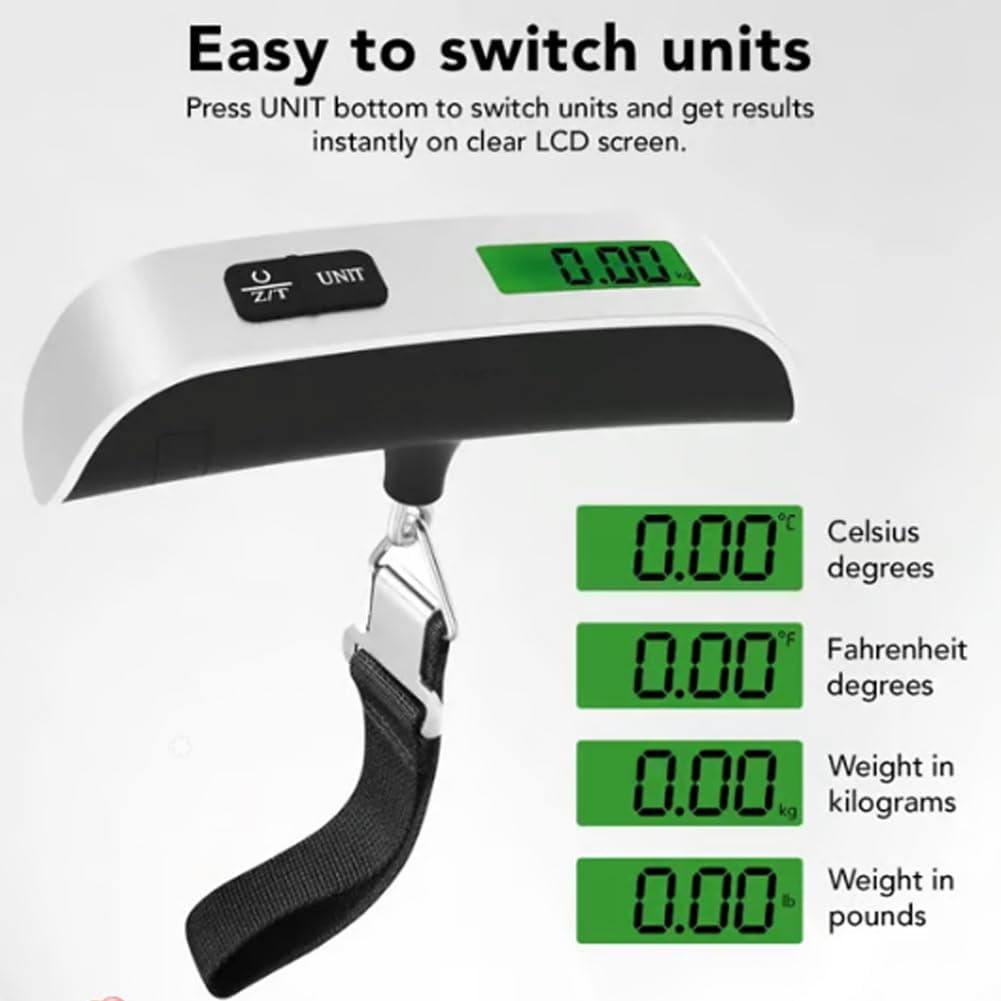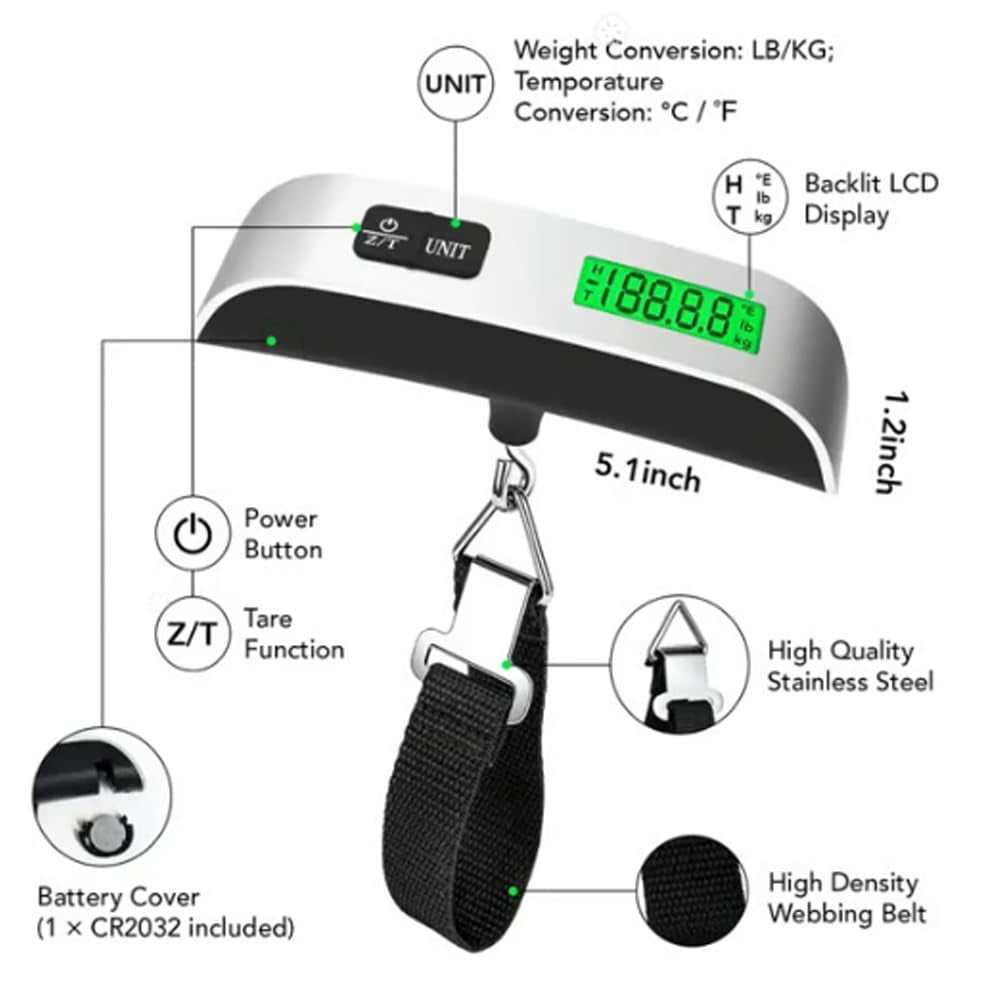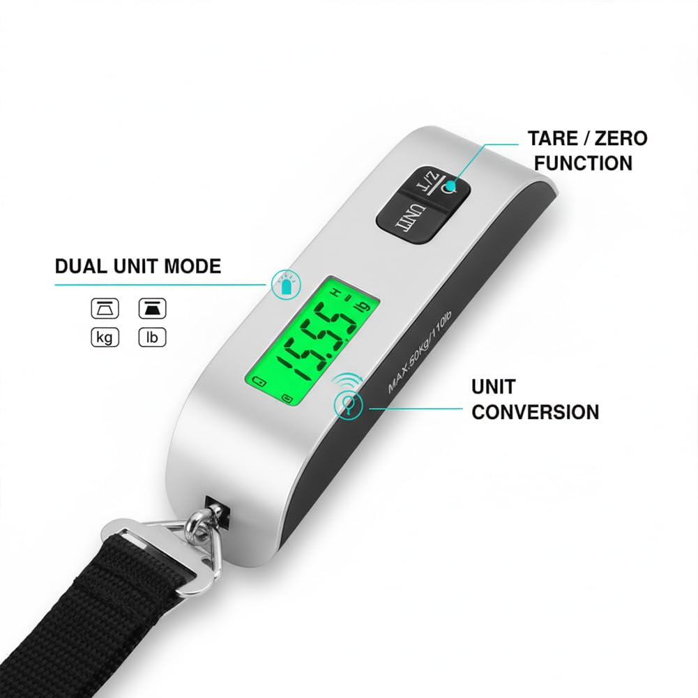 【50KG Max with Overweight Alert】Supports up to 110lb for suitcases, backpacks, and parcels. The built-in indicator helps you avoid excess baggage fees before travel. 【High-Precision Digital Sensor】Equipped with accurate weighing sensors for stable, reliable readings. Perfect for pre-trip checks and everyday home use. 【Clear Backlit LCD Display】Features a bright green backlit screen for easy reading in dim light or at night. Shows weight clearly at a glance. 【Compact & Portable with Strap】Pocket-sized and lightweight for travel. Includes an adjustable strap to secure it easily to any luggage handle. 【Auto-Off & Hold Function】Saves battery by turning off after inactivity. The hold function locks the weight reading once stabilized for convenient viewing.