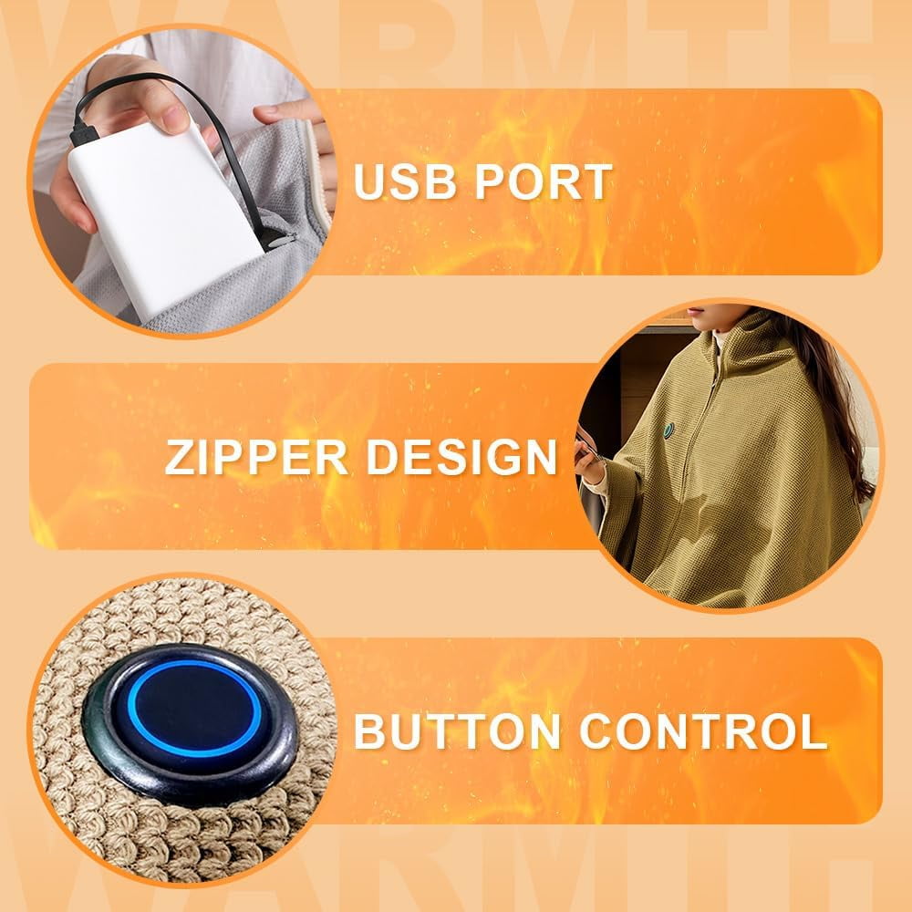 Portable Heated Blanket Shaw, 58″X 32″ Heated Shawl Wraps for Women with 15-Second Rapid Heating & Three Temperature Settings, USB Electric Zipper Winter Wrap