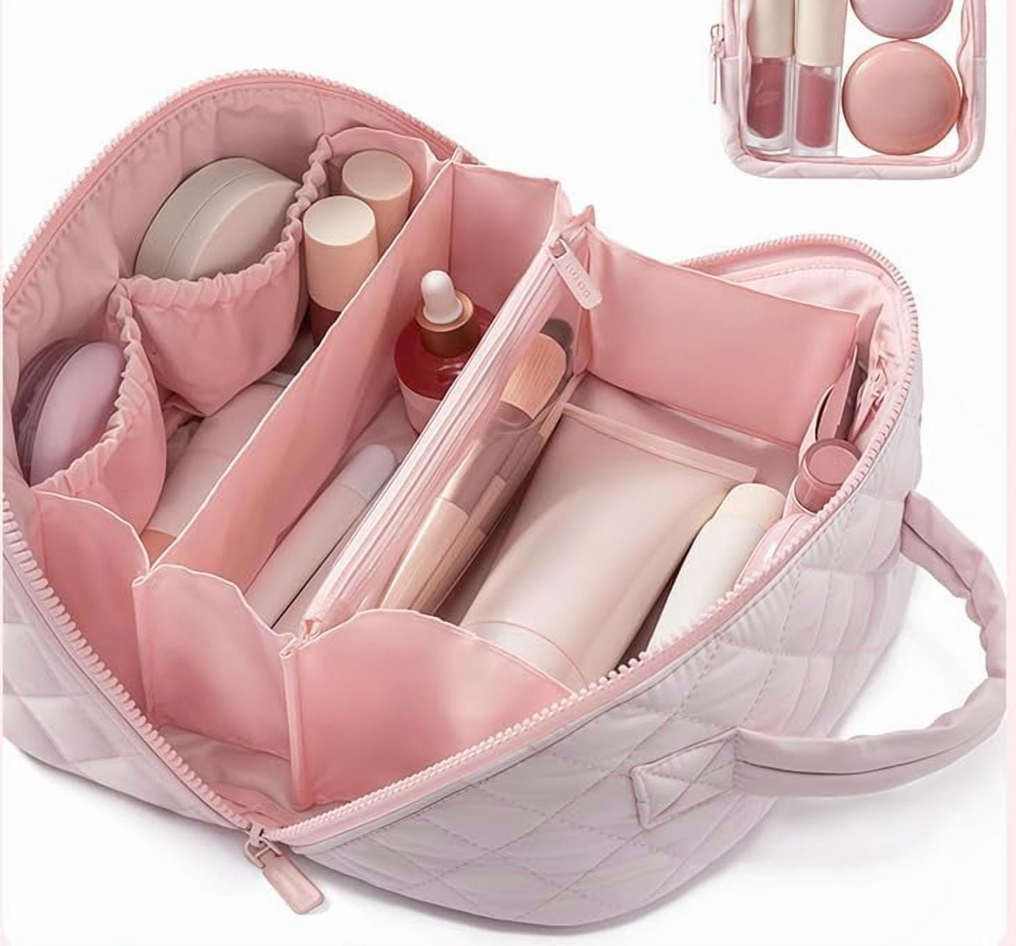 【180° Lay-Flat for Total Visibility】Opens fully flat for a panoramic view of all contents. Eliminates digging and provides instant, organized access to every brush, palette, and bottle in your collection. 【Smart 5-Compartment Spacious Layout】Designed with five dedicated compartments to neatly separate and store your entire routine. Fits foundations, serums, palettes, and brushes in one sleek, clutter-free organizer. 【Triple-Proof Protection Lining】Features a premium waterproof, stain-resistant, and odor-free interior. Safeguards against spills and leaks, keeping liquids, powders, and brushes secure and fresh. 【Cloud-Soft & Machine-Washable Build】Crafted from luxurious, crush-resistant puffer fabric that protects fragile items. Completely machine-washable for effortless cleaning and long-lasting, like-new appearance. 【The Perfect Stylish Gift】An elegant, all-in-one organizer that makes an ideal gift for any occasion. A thoughtful and functional present for beauty lovers and travelers alike.