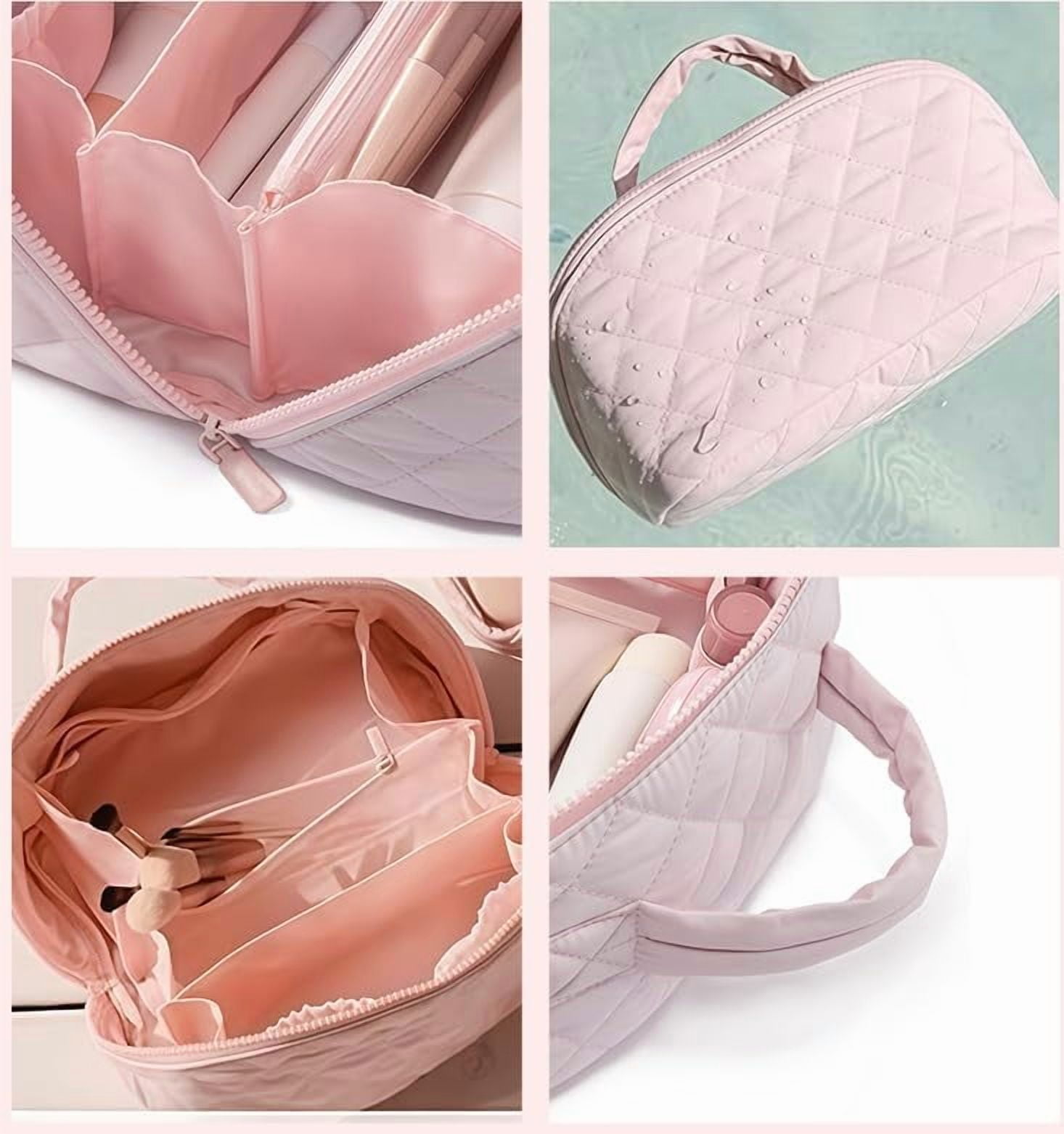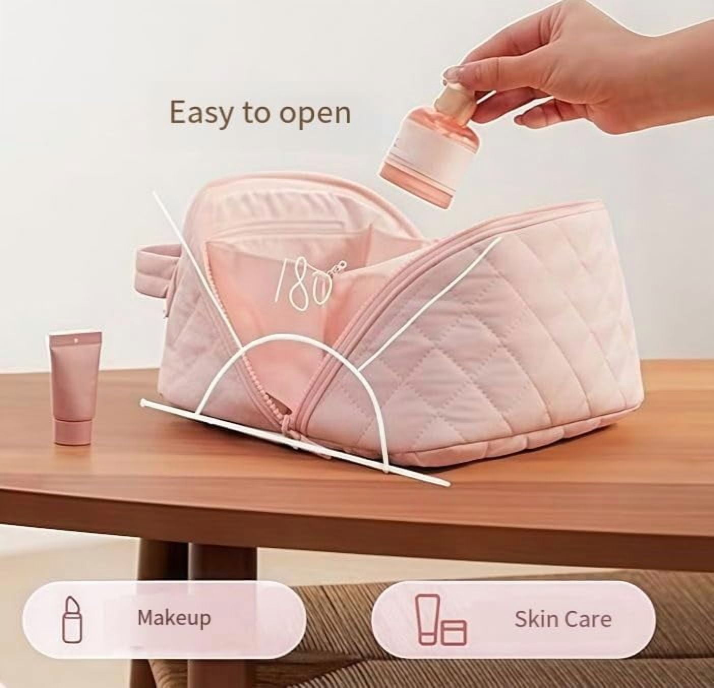 Travel Makeup Bag for Woman, 180° Lay-Flat Cosmetic Organizer with 5 Compartments, Large Capacity Open Flat Puffer Machine-Washable Toiletry Bag for Full-Size Skincare