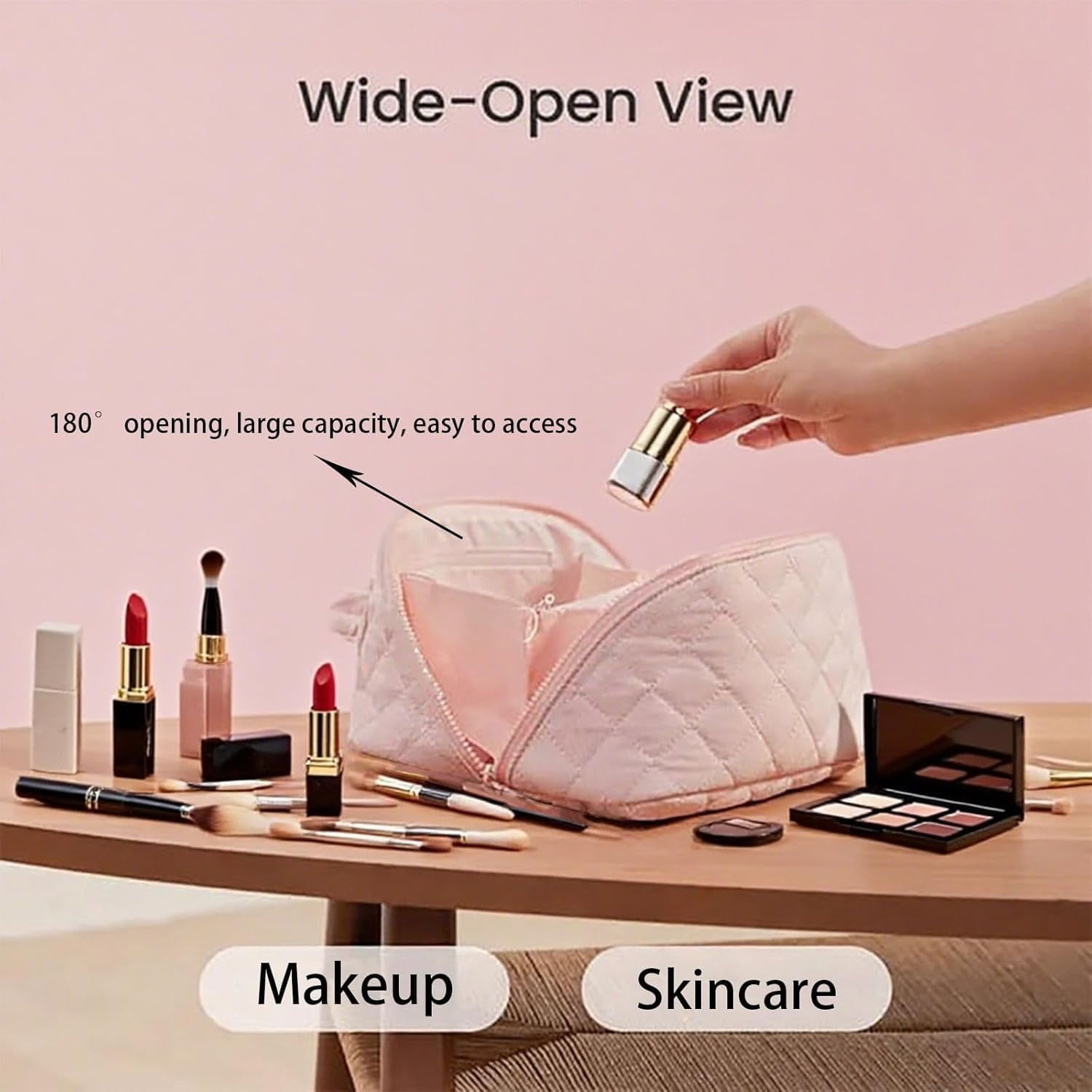 Travel Makeup Bag for Woman, Wide Open Lay-Flat Cosmetic Case, Spacious 180° Open Cosmetic Organizer for Toiletries & Brushes Large Capacity with Compartments