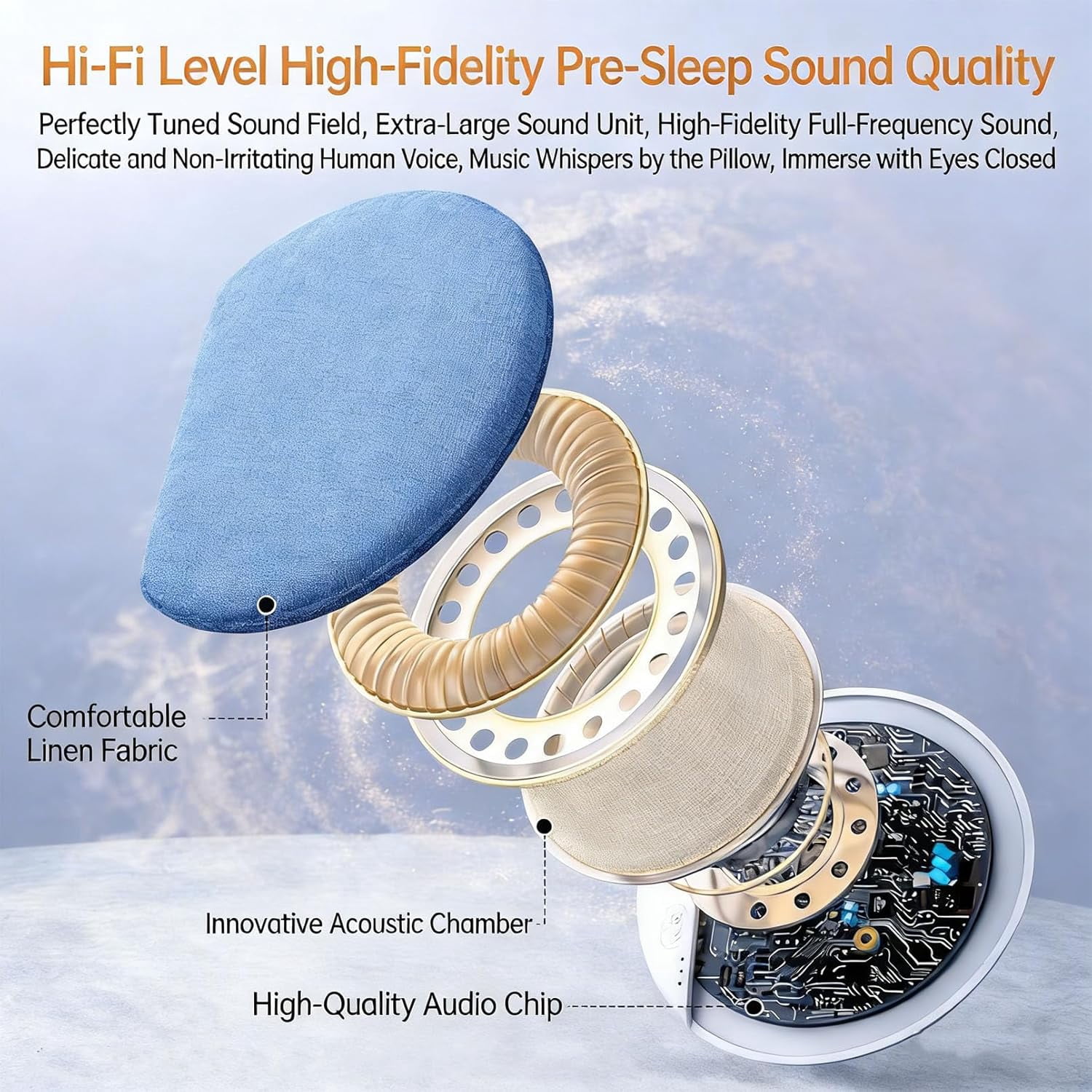 【Enhanced Sleep Experience】Multi-stage acoustic design delivers clear, directional sound directly to your ears for private listening without disturbing others nearby. 【Stable Bluetooth 5.4 Connection】Seamlessly pair with phones or tablets from up to 33 feet away for reliable wireless listening free of dropouts. 【Built-in White Noise for Better Sleep】Preloaded with soothing sounds to help adults and children fall asleep faster and improve overall sleep quality naturally. 【Long Battery Life with Sleep Timer】Enjoy up to 10 hours of playback on a single charge. Set a timer for 30, 60, or 90 minutes for automatic shut-off. 【Easy to Use】Simple button controls for volume and tracks. Note: volume is optimized for low-level, personal listening when placed under a pillow.